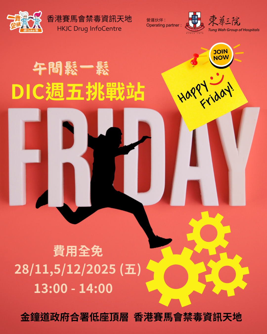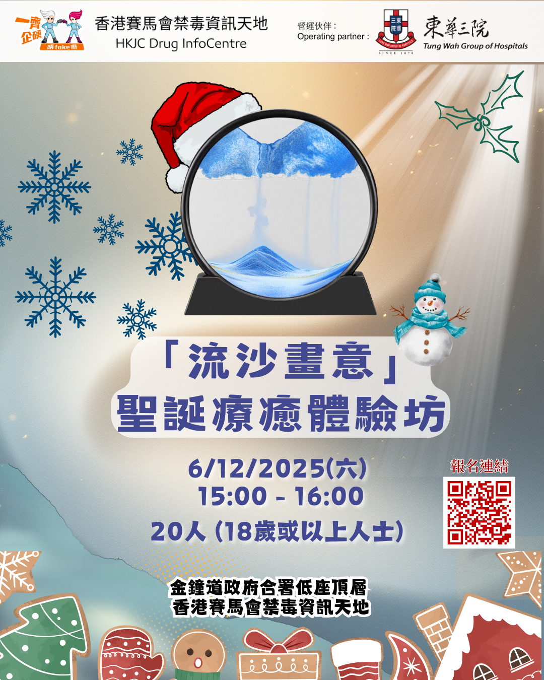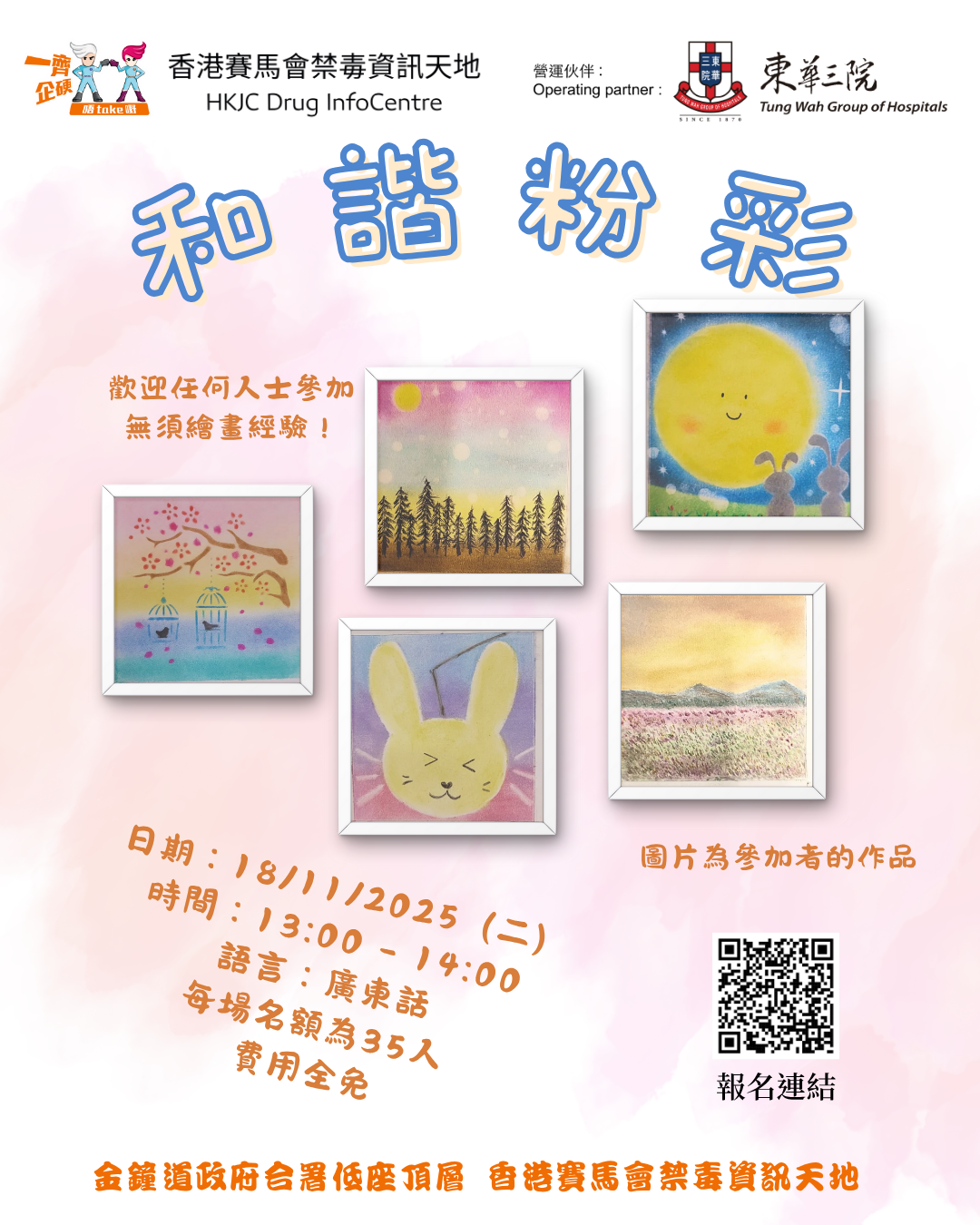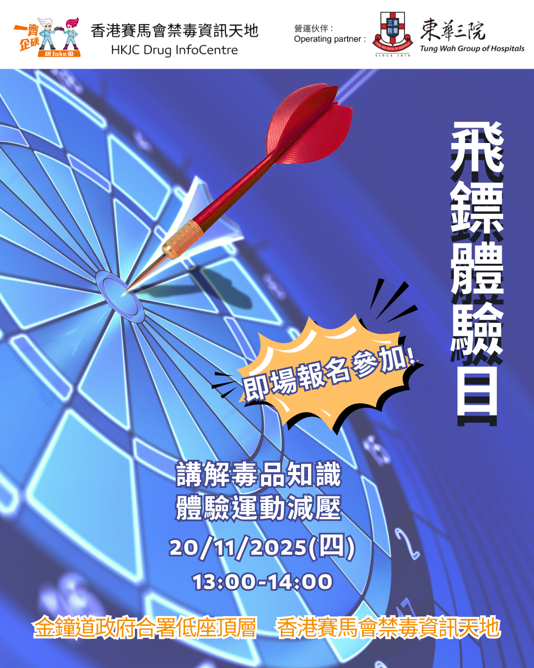 Hong Kong Jockey Club Drug InfoCentre regularly conducts various FREE anti-drug events including (i) anti-drug and positive lifestyle workshops and events, (ii) anti-drug training, seminars and exchange sessions, (iii) anti-drug lunchtime parental talks, (iv) anti-drug parent-child workshops, and (v) thematic exhibitions and activities. (Click here to view event calendar)