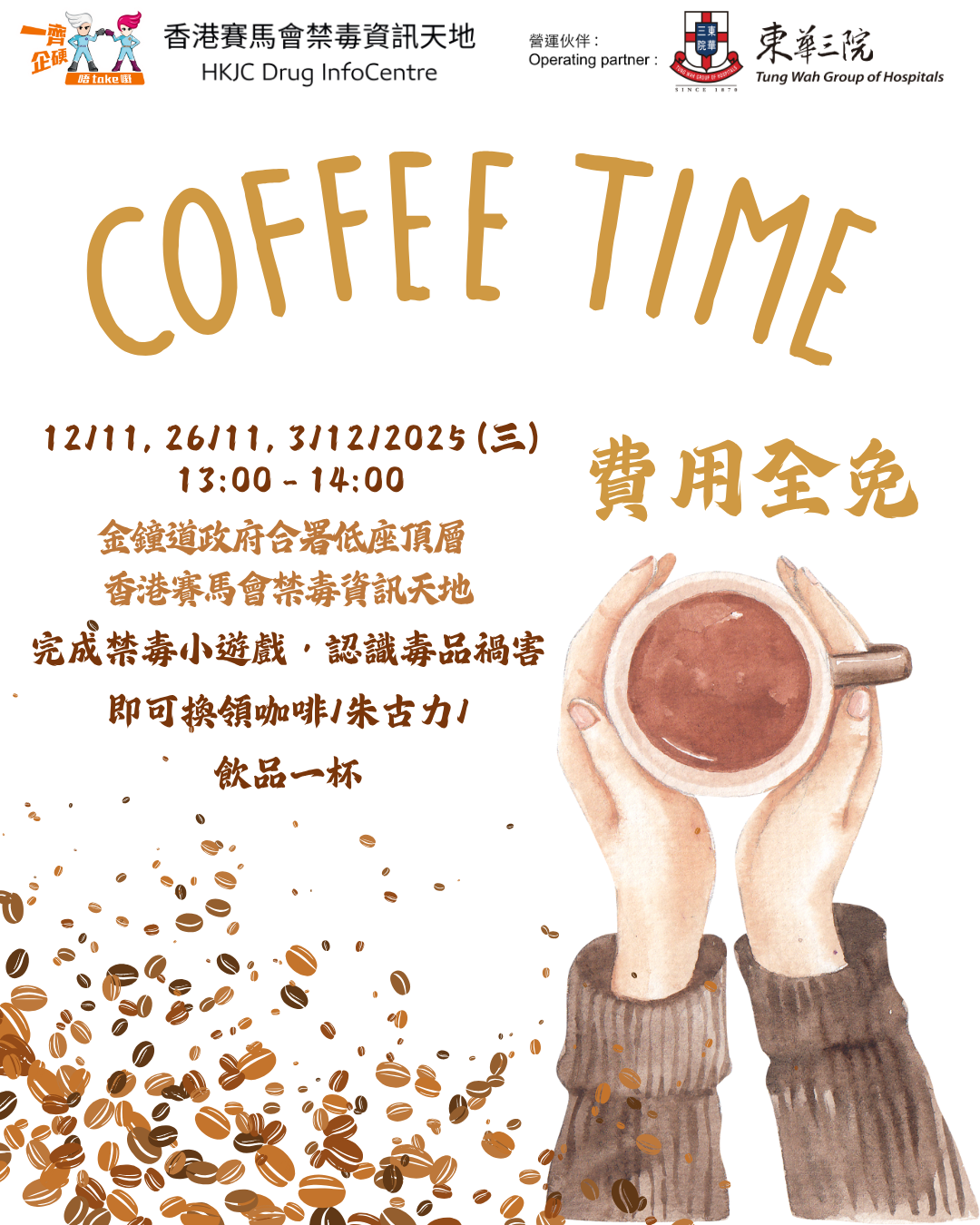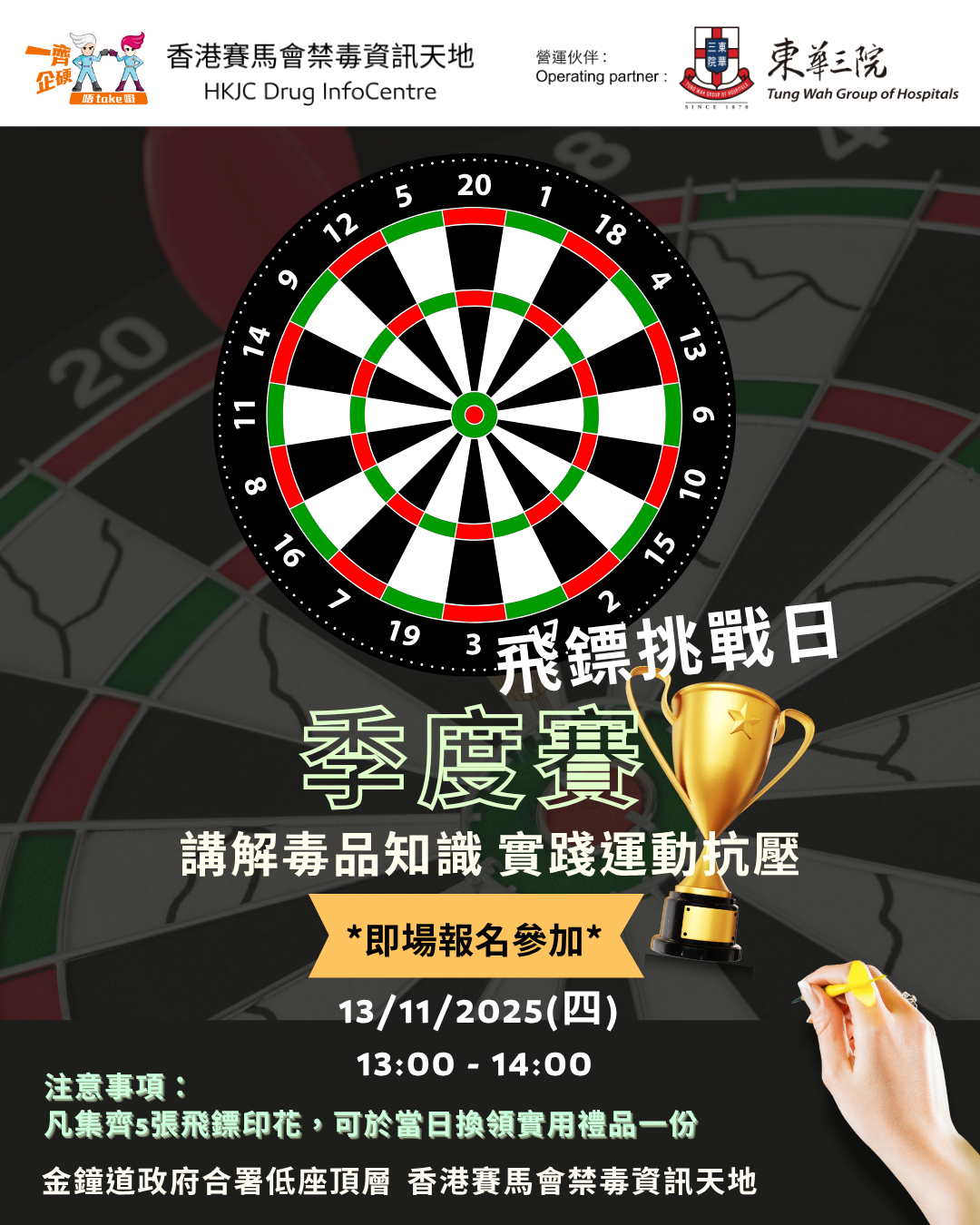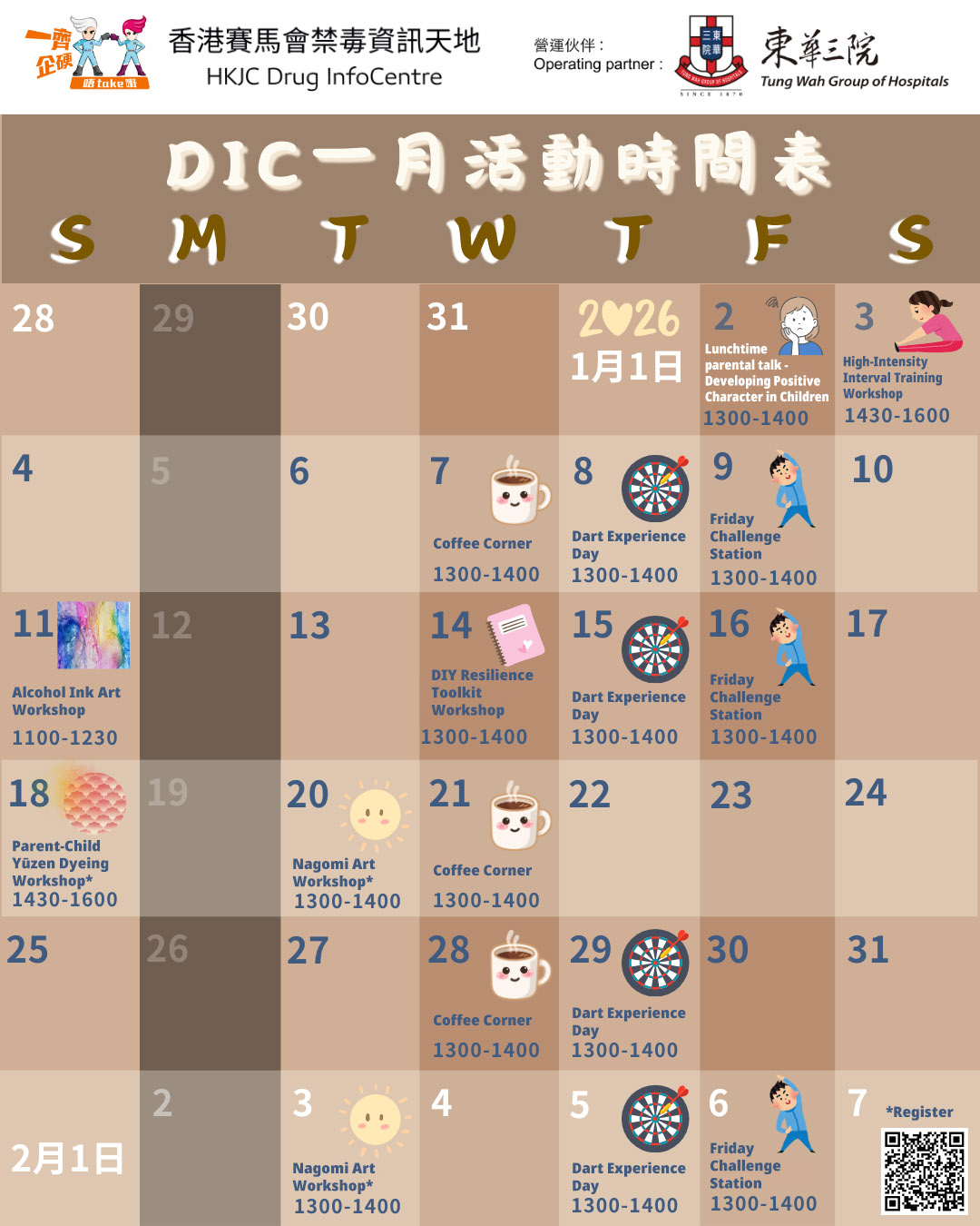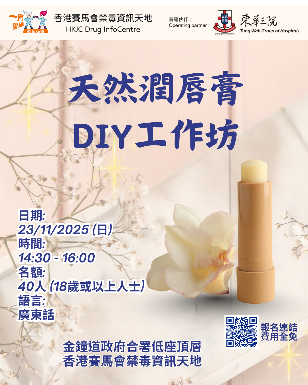 Hong Kong Jockey Club Drug InfoCentre regularly conducts various FREE anti-drug events including (i) anti-drug and positive lifestyle workshops and events, (ii) anti-drug training, seminars and exchange sessions, (iii) anti-drug lunchtime parental talks, (iv) anti-drug parent-child workshops, and (v) thematic exhibitions and activities. (Click here to view event calendar)